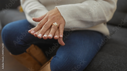 woman, pearl, ring, hand, indoor, relaxation, cosy, sitting, home, attire, jewellery, accessory, fashion, adult, casual attire, clothing, comfort, comfortable, couch, elegance, elegant, female, finger, gold, house, interior, lifestyle, living, luxury, mature, nail, room, senior, simple, style, sweater, trendy, warm, winter, womanhood, age, beauty, closeup, detail, feminine, gem, gentle, knit up, rest