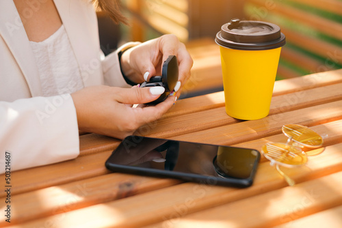 Close-up of a women's hands taking out of the box wireless small black earbuds. Girl at a table with a black mobile smartphone and a glass of coffee and sunglasses . White manicure