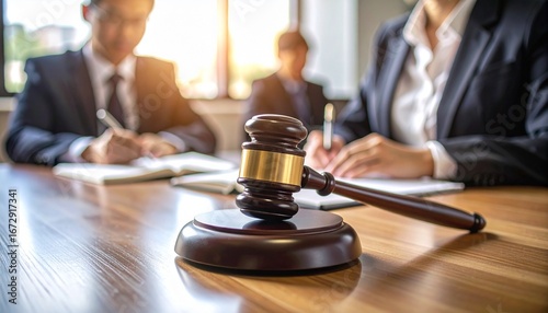 Close-up of a wooden judge's hammer resting on a court desk, with a writing lawyer in the blurry background
