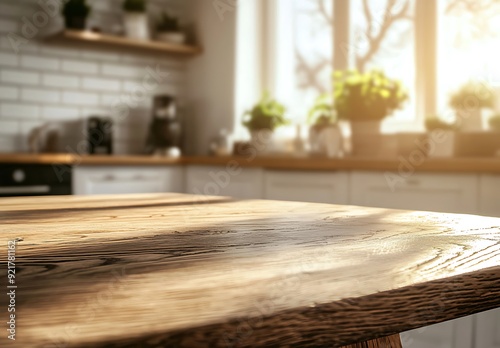 kitchen, table, wood, wood grain, tabletop, countertop, surface, background, blurred, rustic, natural, brown, light, window, sunlight, interior, home, design, decor, space, clean, modern, bright, white, cabinet, furniture, kitchen utensile, breakfast, snack, food, drink, display, product, composition
