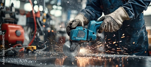 Close-up of a worker operating an angle grinder, cutting metal, with bright sparks flying off the surface during the process
