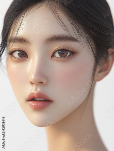 Close-up of a Young Korean Woman with Flawless Skin and Subtle Makeup 젊은 여성의 완벽한 피부와 은은한 메이크업의 클로즈업