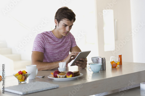 breakfast, hot drink, lifestyle, man, using, beverage, bread, casual clothes, caucasian appearance, closeup, coffee cup, color image, communication, connection, drink, food, food and drink, front view, fruit, fruit salad, holding, horizontal, indoor, jar, looking down, male, medicine, morning, multimedia, one man only, one person, photo, portability, refreshment, teabag, technology, touch screen, touchpad, wireless, wireless technology, young adult