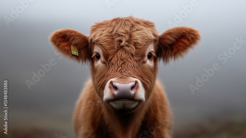 calf, cow, cattle, farm, animal, agriculture, farm animal, brown, red, cute, portrait, rural, nature, wildlife, mammal, domestic, fresh, grass, meadow, outdoors, peaceful, young, baby, adorable, eye, nose, ear, closeup, detail, photo, fluffy, gold, standing, looking, sharpened, fog, mist, farmland, produce, dairy, meat, beef, happy, healthy, pasture, field