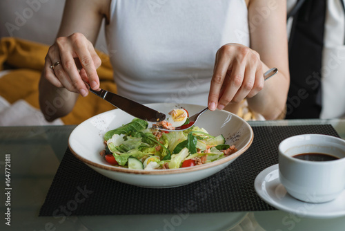 Close-up of a young woman sitting at a table eating a salmon and quail egg salad with a black coffee