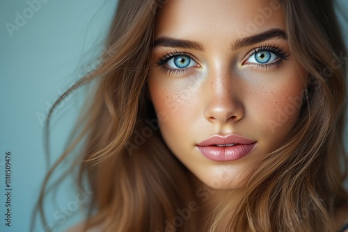 Close-up of a young woman with blue eyes, natural freckles, and flowing hair, on a soft turquoise background. Concept of natural beauty