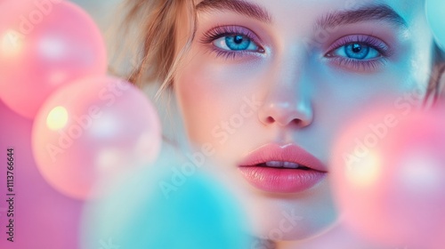 Close-up of a young woman with striking blue eyes surrounded by colorful soft lighting and decorative elements