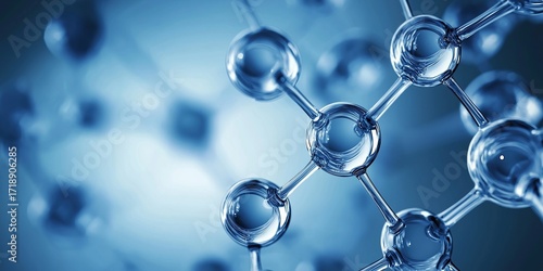 Close-up of abstract blue background with monosodium structure featuring interconnected glass spheres representing organic carbon ring alkyl group molecules in materials science