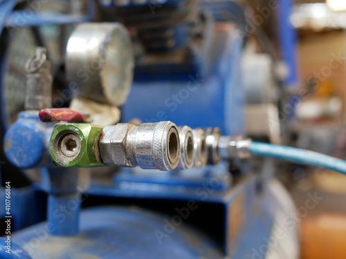 closeup of air compressor system in garage.