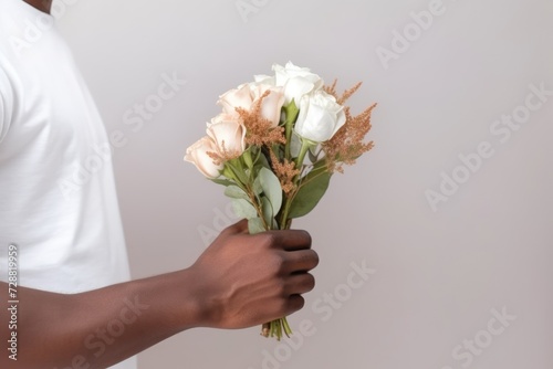 hand, african, male, rose, closeup, holding, cream, white, bouquet, neutral, man, person, background, floral, gift, romance, exchange, present, fresh, stem, leaf, tenderness, love, warm, soft, light, elegant, flower petals, bloom, nature, birthday, valentine, day, gesture, giving, receiving, celebration, botanical, delicate, greenery, offering, surprise, muscular, occasion, simplicity, arm, human, care