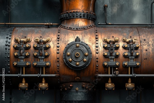 steam engine, antique, copper, brass, metal, machinery, industrial, vintage, technology, retro, old, aged, patina, texture, detail, intricate, mechanism, engineering, craftsmanship, rivet, bolt, nut, pipe, steam, power, history, industrial revolution, artifact, clockwork, gear, boiler, dark, grunge, background, photo