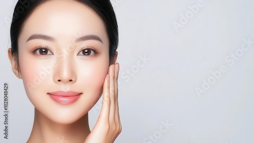 Closeup of an Asian woman with smooth skin and subtle bronzer, creating a glowing, sunkissed look sunkissed, smooth skin, glowing face