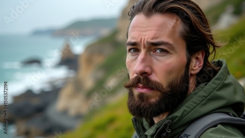 Closeup of an athletic bearded man hiking by Langre Beach, Spain, admiring gravity-defying landscapes in moss green tones.