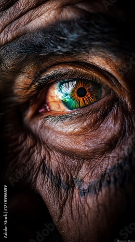 Close-up of an elderly Maori woman's eyes, golden irises and deep wrinkles illuminated by a dim stone lantern