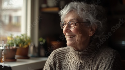 Close-up of an elderly woman with silver hair and glasses, smiling while streaming on her laptop, wearing a cozy sweater in a homely setting with soft morning sunlight through the window.