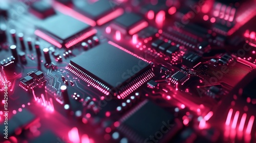 Close-up of an electronic circuit board with red lighting, featuring small black microchips and pink circuit traces, creating a futuristic atmosphere.