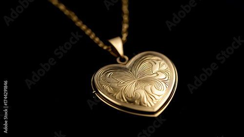 Close-up of an exquisite golden heart locket pendant on a delicate chain, showcasing intricate floral engravings against a deep black backdrop.