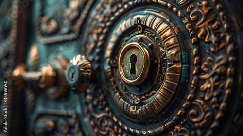 Close-up of an intricately designed vintage lock on an ornate metallic door, showcasing craftsmanship and detail.