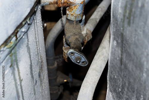 Close-up of an old industrial valve covered in dust and rust, part of a weathered piping system in a factory or train engine compartment