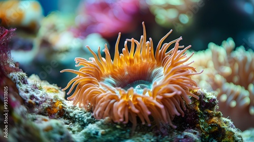 sea, anemone, tentacle, orange, coral, reef, ocean, underwater, invertebrate, marin, life, nature, macro, photo, colourful, vibrant, beautiful, delicate, fragile, ecosystem, aquatic, animal, water, blue, green, pink, yellow, white, brown, texture, pattern, background, biology, wildlife, flora, fauna, tropical, oceanic