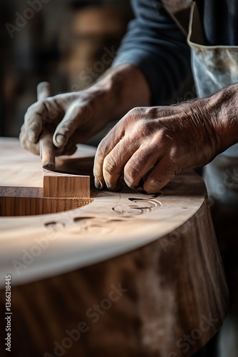 Close-up of artisan's hands carving a wooden surface