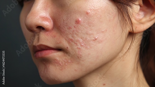 Close-Up of Asian Woman’s Face with Visible Acne and Blemishes Including Red Papules, Whiteheads, and Cysts, Showing Uneven Skin Texture and Inflammation Under Natural Lighting