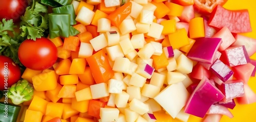 Close-up of assorted colorful chopped vegetables on vibrant yellow background, bright, healthy