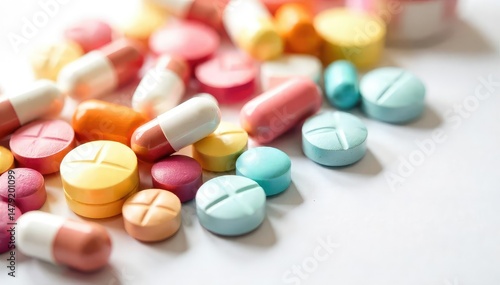 Close-up of assorted pills and capsules on a white background , illness, apothecary, pills