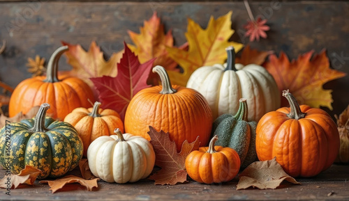 Close-up of assorted pumpkins, gourds, and autumn leaves on a wooden surface, cozy harvest theme, no faces visible, stock photography style
