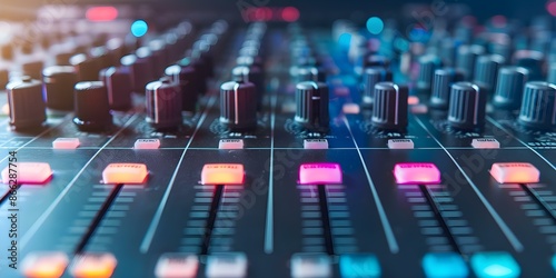 Closeup of audio mixing console in professional sound studio during live broadcast. Concept Professional Sound Studio, Live Broadcast, Audio Mixing Console, Closeup Shot