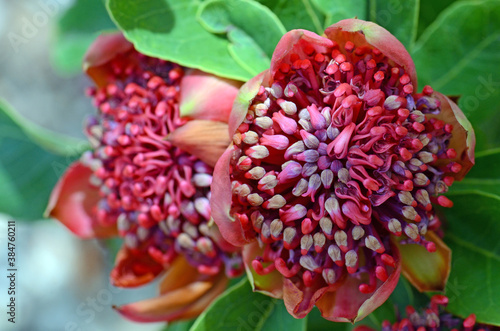 Closeup of Australian native waratahs, viewed from above, Telopea speciosissima, family Proteaceae. Endemic to New South Wales