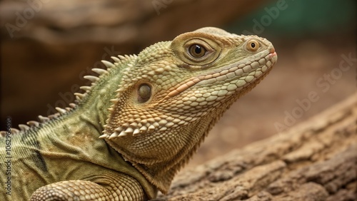:Close-up of bearded dragon with scaly, spiny skin.