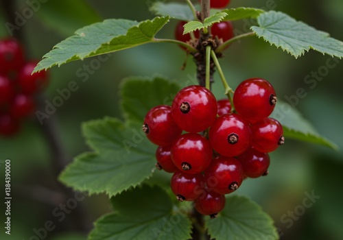 Closeup of berry cluster, Bright red currants, Close up of ripe red currant berries hanging on a branch with green leaves, Vibrant green leaves, ready to be harvested,