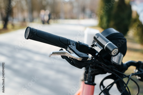 bicycle, handlebar, flashlight, park, outdoors, bike, active, sport, outside, sunny, day, closeup, selective focus