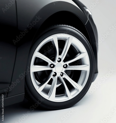 Close-up of Black Car Wheel with Silver Rim on White Background
