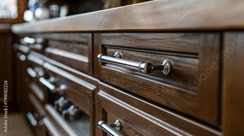 Close-up of brown luxury kitchen cabinets with sleek stainless steel handles, blending modern with vintage