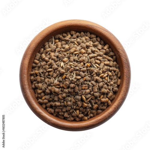 Close-up of Brown Spice Seeds in a Round Wooden Bowl on White Background