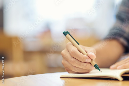 Close-up of businessman hand with pen writing on notebook. Business and education concept.