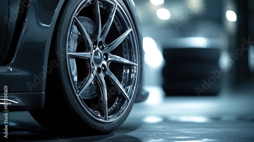 car, wheel, tire, alloy, sport, automotive, automobile, vehicle, black, metal, rim, spoke, design, chrome, glossy, shiny, performance, luxury, racing, speed, transport, transportation, grey, silver, dark, detail, close, up, photo, studio, background, blurry, out, of, sharpened, shadow