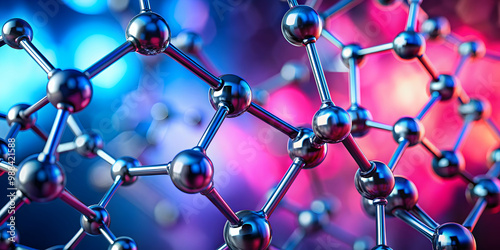 Closeup of carbon chemical structure on pink and blue background with blurred backdrop, carbon, chemical, structure, closeup