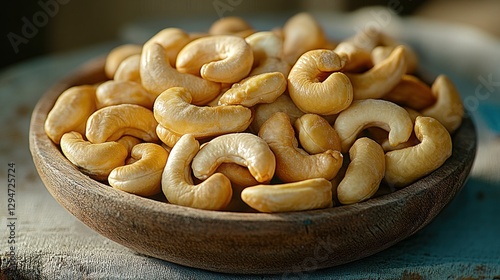 Close-up of cashews in wooden bowl on textured surface, blurred background