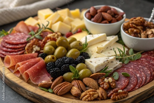 Closeup of Charcuterie Board with Meats Olives and Nuts - generated by ai