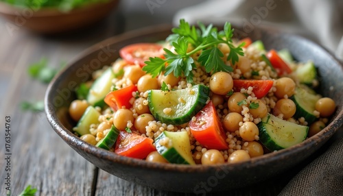 Close-up of chickpea salad with couscous tomato and cucumber. Fresh garnish tops this healthy mediterranean bowl. Meal served on rustic wood table.