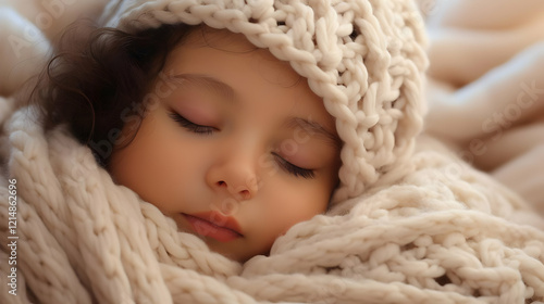 Close-up of Child Sleeping Peacefully Wrapped in Cozy Knitted Blanket