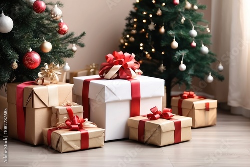 Close-up of Christmas tree with red balls and bokeh in the background. Background with copy space for holiday design.