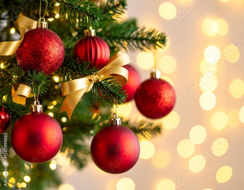 Close-Up of Christmas Tree with Red Baubles and Blurred Warm Lights