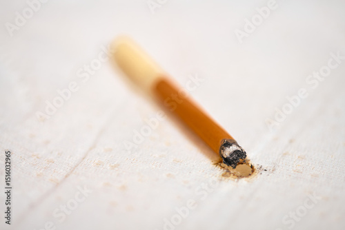 Close-up of cigarette resting against white fabric, leaving burn mark. Soft lighting highlights damage, contrasting with brown and white tones. Shallow depth of field focuses on burn area