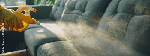 Close-up of cleaning the sofa in the office using a sofa cloth and spraying with disinfectant