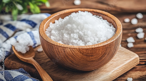 Close-up of coarse sea salt in a wooden bowl placed on a rustic wooden table, highlighting its natural texture and culinary appeal.