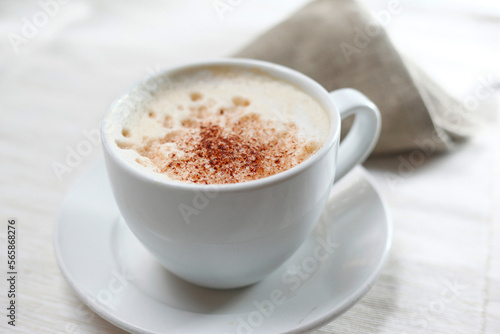 hot drink, served, table, closeup, drink, coffee cup, cup, saucer, fresh, ready-to-eat, foam, latte, hot drink, still life, non-alcoholic beverage, indoor, nobody